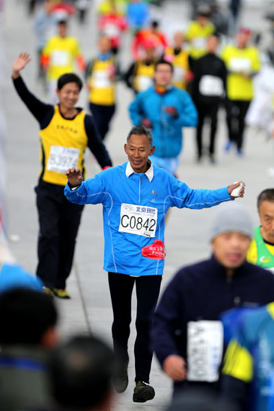 今年北馬最高齡選手75歲的李有年老人,作為"給孩子送雙運動鞋"公益行動的志愿者,5小時40分跑完了42km馬拉松全程